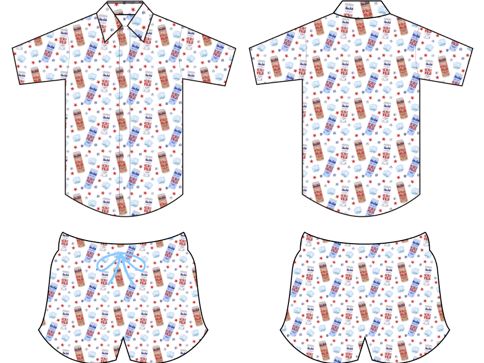 The coolest thing you'll wear all summer! Collared short-sleeve shirt with matching 5.5in inseam. Unisex repeating can pattern on a white background.